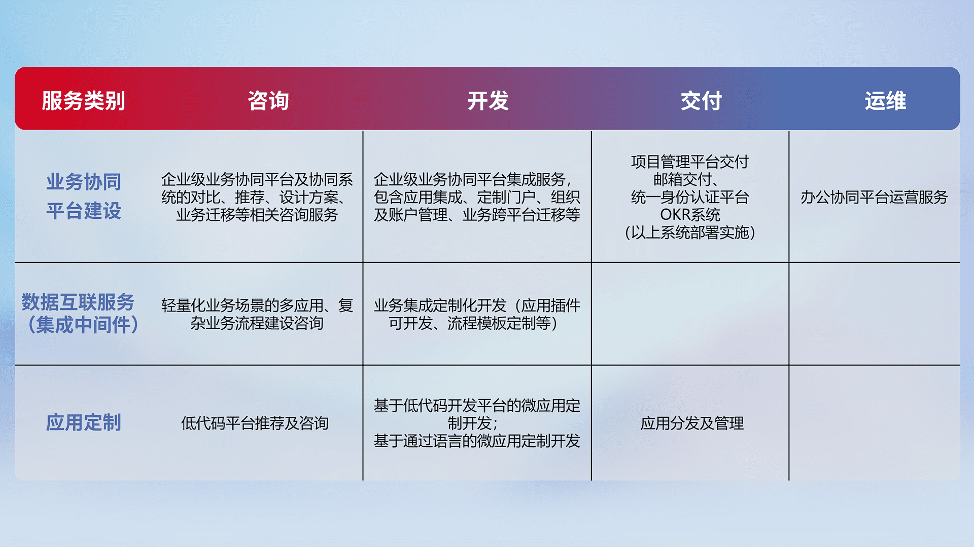 针对钉钉、、、、企微、、、、IDaas等平台级产品提供产品的规划、、、方案、、、交付、、、定制化开发等服务,,,,实现如统一协同办公、、智能客户服务、、、、混合会议管理、、、智能数据查询、、等业务场景,,,实现数字化转型。。